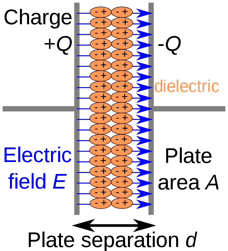 This is not the case with a capacitor. A capacitor is specially constructed and isn’t all just a single conductor. It switches from conductor to dielectric to conductor. Conductors and dielectrics differ in how electrons move. In a conductor, electrons are free as the wind, all they need to move is some voltage to push them wherever you please. In a dielectric, the electrons are bound to the nucleus. Unless you provide a very large amount of energy to break that bond, they are tethered. If you try to apply a voltage, for a very short amount of time the dielectric will look like a short and there will be no voltage drop across the device. Charge carriers are not actually moving through the conductor-dielectric boundary, they can’t do that. Instead you’re packing more and more positive charge onto one side, thereby changing the voltage. What this bunched up concentration of charges is doing is polarizing the individual atoms in the dielectric. That motion of charges, believe it or not, is a form of current. The polarization in the dielectric also pushes and pulls charges on the plate on the other side, thus allowing current on one plate to generate current on the opposite plate.