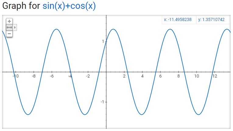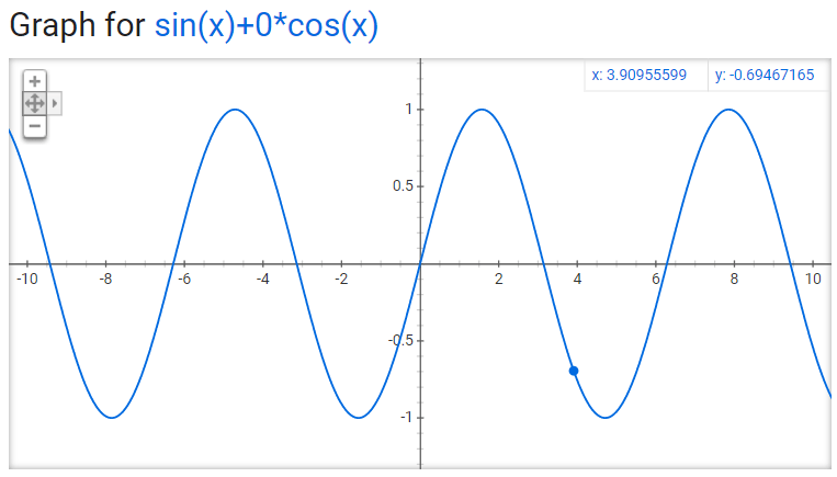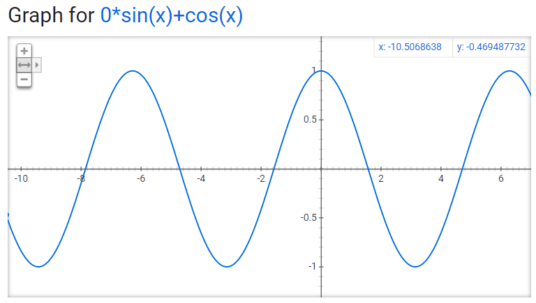 Okay, so this is pretty self-explanatory. A sine wave and a cosine wave. Sine wave starts at 0, cosine wave starts at 1. You’ll notice if you just move the sine wave around you can make it look like a cosine wave. This should be elementary to anyone reading this. Let’s take a look at what a lot of you don’t know though. Let’s see what a wave with a sine and cosine *component* look like. Not just together equally, but with different amounts for each.