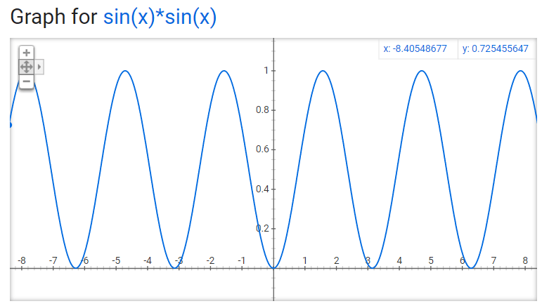 Notice something? For one, it pretty much looks exactly like a regular sine wave, nothing funky. But more importantly, the entire thing is positive, above the x-axis. It makes sense right? Unlike the other products of sine waves, this one is unique because it’s a sine wave multiplied by a sine wave of the same frequency, which makes it a sine wave squared. Squared value, whole thing has to be positive. And when you put that into an integral you get a non-zero value. It’s sort of like it still swings around 0, but raised up a bit. If your input sine wave is shifted in phase, it can be broken into a sine and cosine wave, so you’ll get a sine wave squared plus a cosine wave squared (a sine wave multiplied by a cosine wave just gets you a sine wave with twice the frequency and half the amplitude, so again integrates into oblivion).
