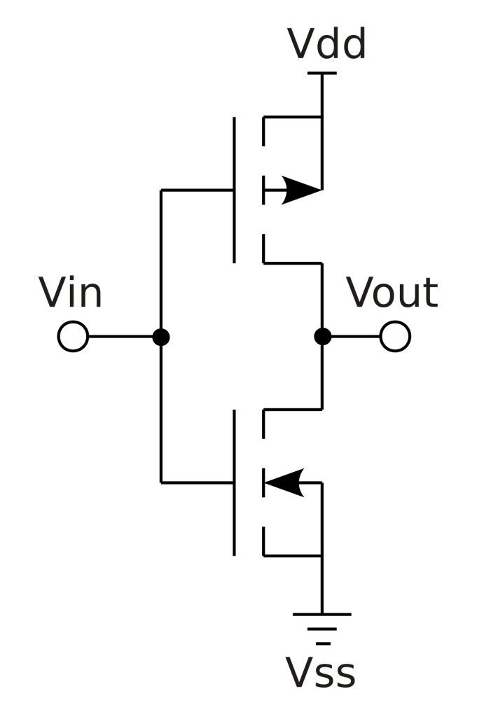 A P-MOSFET on top of an N-MOSFET creating a CMOS inverter