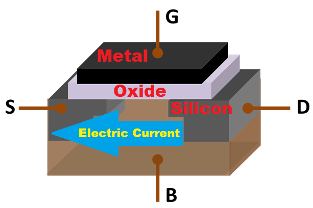 While many types of transistors (and vacuum tubes before that) were used to create computing devices, the key breakthrough technology is this neat silicon configuration invented in 1959 in Bell Labs by Mohammed Atalla and Dawon Kahng called a MOSFET, which stands for Metal-Oxide-Semiconductor Field Effect Transistor. That’s a long name but we can break it down into pieces. Metal-Oxide-Semiconductor refers to the “sandwich” of materials that the main body of this device is made of. The metal is a conductor, so we can easily apply a voltage to it. The semiconductor (silicon) is the base that the whole computer chip is made of, and right now it looks like an insulator so no current flows through it. The oxide is a thin insulating layer that separates the two. We apply a voltage, that is to say we push *positive* charges, onto the metal, and that pulls a bunch of electrons up to the top of the silicon, creating an electric Field. Now that there’s a bunch of free electrons, the silicon is a conductor, and current can flow through it horizontally, which is the Effect of the Field. Using our water analogy, this device is basically a pressure controlled valve. But where is that applied voltage coming from? Another MOSFET, which gets its voltage from another MOSFET etc. Its MOSFETs all the way down. Your phone contains millions if not billions of these, so there’s plenty to go around. Modern MOSFETs don’t actually use metal anymore but the name stuck around for simplicity.