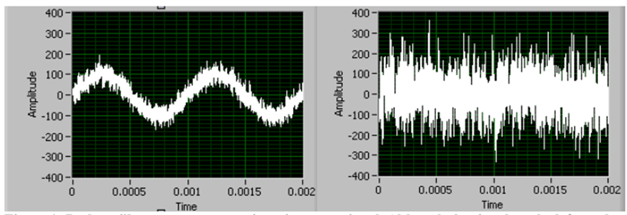 This provides some advantages. The image below shows a signal, and the same signal buried in noise. The lock-in amplifier can get you the magnitude and phase of the signal of interest with ease in both situations.