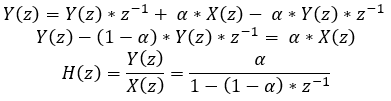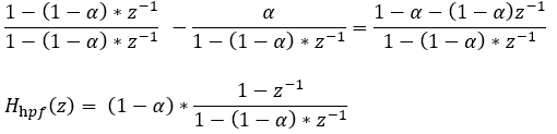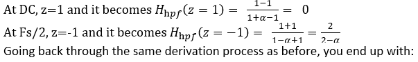 What’s interesting about this is that while it does block DC (it outputs 0 when z=1), at the Nyquist frequency Fs/2 (z=-1) it attenuates the signal to 2*(1-a)/(2-a).