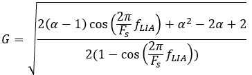 Substituting everything back in, the final gain correction that should be applied to a frequency given a certain alpha is