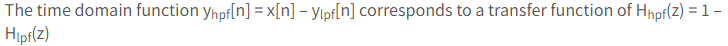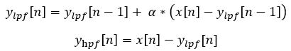 Examination of the code found out that in an effort to minimize clock cycles, rather than using the low pass to create the high pass, whoever implemented it found a recursive trick and created the low pass using the high pass, reducing the number of instructions. But by doing so they didn’t realize that the next high pass index would be using the previous low pass index, when what we want to do is use the current low pass index. Mathematically, our new time-domain equation becomes: