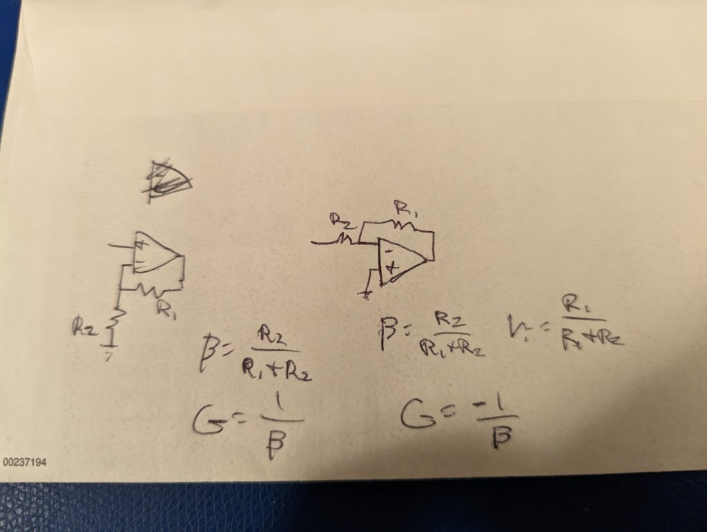 Cue record scratch. I was immediately ripped from my slumber. The gain of an op-amp is -R1/R2 if the input goes into the negative terminal, and it magically becomes R1/R2+1 if the input goes straight to the positive terminal. And the negative feedback does all this. As if the op-amp and the concept of negative feedback and these simple equations were handed down on stone tablets in the mid-20th century.