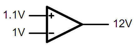 Let’s take this amplifier stage and strip away everything and build it back up. We have two input terminals, and one output terminals. We now know that those two inputs need to be really close to equal to keep the tug of war happy. They don’t need to be equal, in fact they shouldn’t be equal, they need to be sort of equal. Equal-ish. How can we let the inputs know that they’re doing the right thing? If they don’t have any feedback, they’ll just shoot to infinity! When one input transistor has a higher voltage, it’ll just yank on that rope until the output hits the rail. In the case below, the positive terminal is slightly higher than the negative, it pulls the rope so the output hits the high rail of 12V.