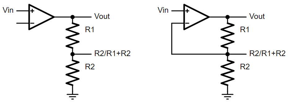 So let’s start there. Voltages. What can we do with them? The simplest circuit I can think of is a voltage divider. Let’s put a voltage divider on the output. We could measure the output, write it down, and then adjust the input. Or just…directly tie that voltage divider back to the input and make it all happen automatically.