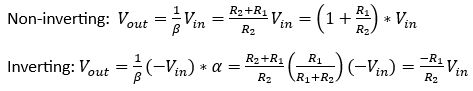 Let’s get back to what what intern said. Why is it that in the inverting configuration, the gain is -R1/R2, but with the non-inverting it’s 1+R1/R2? Looking at the back of the envelope drawing above, you can see that both circuits have the same feedback factor. The difference is that with the inverting configuration, the input also has a feed*forward* factor, which will be denoted alpha. See, with the non-inverting, the input voltage is wired directly to the positive terminal. With the inverting configuration, if you look, you’ll notice that the op-amp isn’t actually seeing the input voltage. It’s seeing the input voltage divided down by R1 and R2. That’s what the op-amp is providing gain to. From this perspective it makes sense right? The equations below illustrate this.