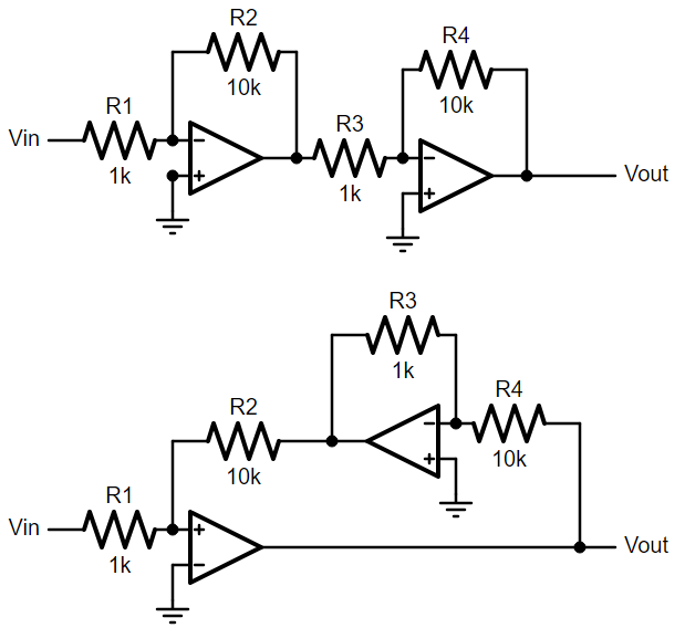 The circuits above show a clever use of feedback factor to improve the amplifier. The first circuit is called a cascaded amplifier. Two amplifier blocks, each with a gain of -10, so the overall gain is (-10)*(-10)=100. Pretty simple. But by understanding feedback factor, we can reconfigure it to the second circuit. From a network theory perspective, these two circuits are actually completely equivalent if you write out the mesh network matrix, but we can avoid that by thinking about the feedback factor. Two things to note, the first op-amp now has feedback going to its positive terminal instead of negative. This is still negative feedback because the second op-amp already has a negative gain. R3 and R4 are swapped, so rather than a gain of 10, it actually has a gain of 1/10th. What this does is it divides the first op-amp’s feedback factor by another factor of 10, and therefore makes its overall gain 100 rather than 10.