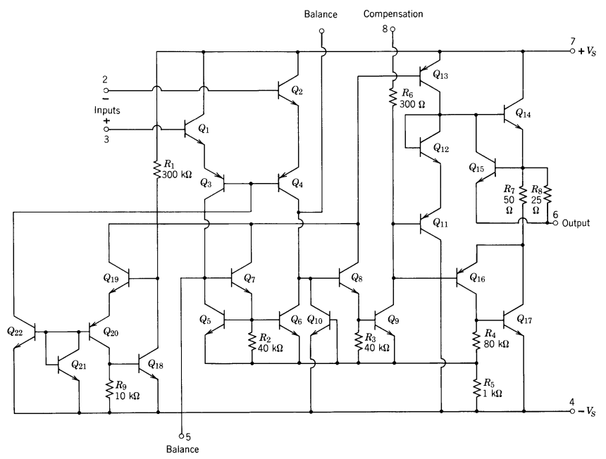 To illustrate that op-amps aren’t magical components, below is what’s inside an LM101, as shown in Prof. Roberge’s book available for free on MIT OCW “Operational Amplifiers: Theory and Practice”