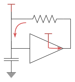 This is a recipe for disaster, an endless positive feedback loop. The capacitor will also naturally discharge through the resistor, but if the capacitor is charged faster than it discharges, then the amplifier’s output gets bigger and bigger instead of stabilizing. The path for dissipating energy is also the mechanism for injecting energy back in???? Straight to jail. The output may rail high or low or oscillate between the two. So if we have any sort of poles or zeros with gain/amplification, we have to be careful. Maybe our output doesn’t get fed back to the input, or that the amplification blows itself up.