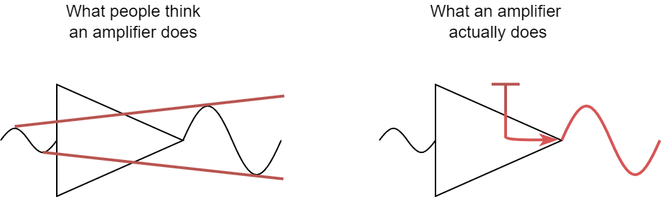 Amplifiers look at their inputs, and then output something based on that input. That output is coming from the power source. Amplifiers aren’t creating energy from nothing, they’re not transforming the input into an output. They’re directing energy in from an external source to give the illusion of making the input bigger.