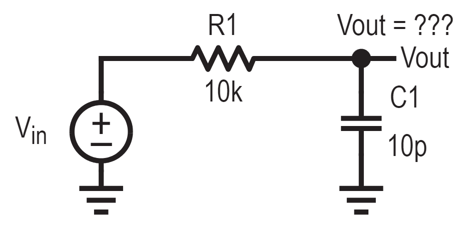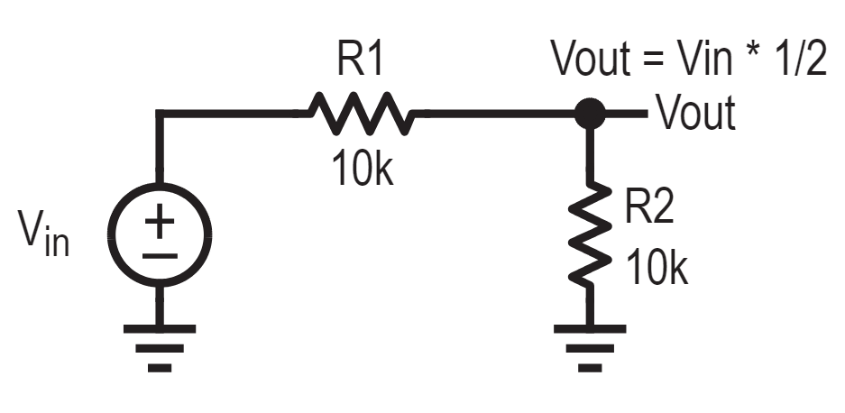 The circuit below should be familiar, it’s a simple voltage divider. This is about as simple of a transfer function as you can get. The output is half the input. The transfer function is simply 1/2, super easy.