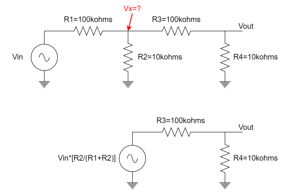 In this scenario, if we tie a wire from Vx to ground, all the current going through R1 would go through it since it shorts out R2. That current, by Ohm’s Law, is just Vin/R1. That’s our “short-circuit current”. Let’s remove that wire, and replace it with a voltage source of our own. If we turn off Vin, now the other side of R1 is 0V i.e ground. That makes R1 and R2 in parallel, which is R1*R2/(R1+R2). That’s the driving-point-impedance (DPI). Multiply the two together and you get the voltage at that node. In this case it’s a simple voltage divider, which we probably could have easily guessed, but for circuits with even a slightly bit more complexity, this method lets us tackle it piece by piece while still respecting the rules of KVL/KCL.