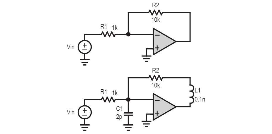 If we take the op-amp above and put it into a standard inverting amplifier configuration, we might actually be creating a slightly different circuit because of the parasitics. Zeros and poles have been added just from the physical construction.