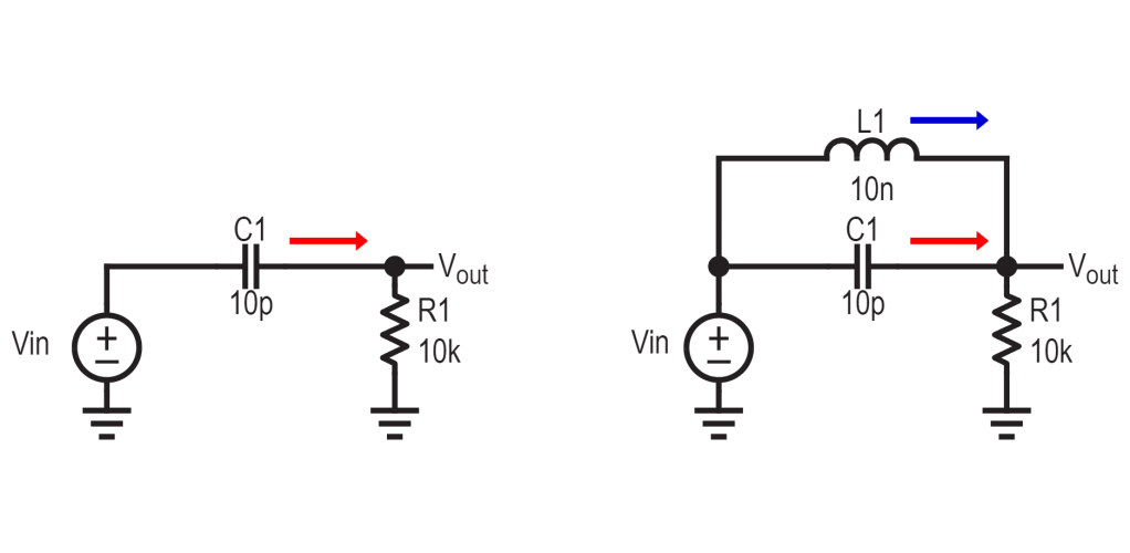 In the circuit on the right, however, the inductor provides an alternate path around the capacitor. As we increase the frequency, the capacitor is more reasonable but at super higher frequencies the inductor becomes a pain in the ass. If we go back down, at juuuuust the right sweet spot in the middle, both the inductor and capacitor are being equally difficult. Once again, the resistor dominates and pulls the output low. This means we have a zero at some finite frequency, and now it appears in our transfer function.
