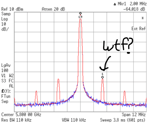We’re almost done here. Now remember I said we switch rapidly between frequencies and average? In the long run yes it looks like the exact precise fraction we want, but it isn’t actually. We end up with artifacts, frequencies we don’t want. These are known as spurious tones or “spurs”. Most of the time these spurs are fixed, but in many situations, particularly in the kind we’re looking at here, those spurs can slowly shift back and forth in frequency, or “wander”.