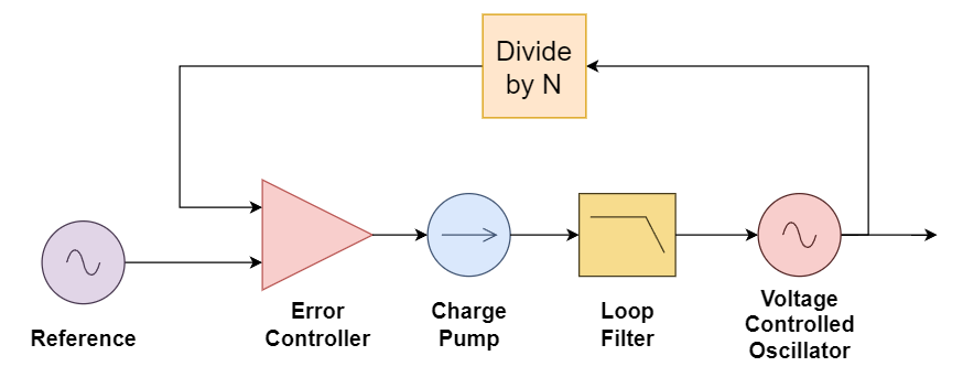 The circuit system used to generate and stabilize the clock is known as a Phase-Locked Loop (PLL). At its most basic representation, a PLL consists of a low frequency but very stable reference (often a crystal), a very high frequency but unstable oscillator, a feedback frequency divider, and an error controller. The “voltage controlled oscillator” (VCO) is crazy fast, it can easily be tens of GHz if you’d like, but is a loose cannon that doesn’t play by the rules. The reference on the other hand is quiet, loves to work steady, measure twice and cut once, but it’ll take its time (literally). By dividing the VCO’s output and feeding it back to the controller, the controller can compare it with the reference and adjust the VCO accordingly, thereby combining the precision of the reference and the speed of the VCO. Feedback is cool.
