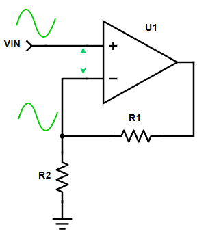 An example is the circuits above, a standard op-amp amplifier, non-inverting. The input voltage is swinging by say 500mV. 500mV sounds pretty big compared to what we were talking about earlier. But look at the op-amp circuit overall. It has negative feedback, so its inputs stay almost exactly equal. When the positive input goes up by 500mV, the negative input is also going up by very close to 500mV. We can even zoom in, inside the op-amp and see the inputs.