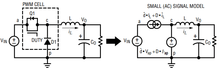 That output voltage is dependent on the ratio of switching, the duty cycle. If the inductor is connected to node 1 for 80% of a 200kHz square wave, and to node 2 for the other 20%, we call that an 80% duty cycle, a variable simply denoted “D”. The switches are transistors that are in fact switched, on and off, very quickly in what’s called Pulse Width Modulation (PWM). There is no “small signal” that they see, no abstract condition, they really are turned fully on and fully off with (ideally) no in between state, no metastability crap. So why are we even talking about this?