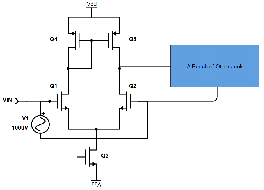 Q1 is the “PLUS” and Q2 is the “MINUS”. There’s all sorts of other stuff happening, but at a basic level Q1 and Q2 do like 90% of the work in an op-amp and are where most of the focus goes. Because of negative feedback, whatever Vin does to Q1, the “bunch of other stuff” takes the amplified Vin and sends it to Q2, which inherently almost cancels out the effect of Vin on Q1. Almost. The op-amp “sees” a difference at its inputs, at Q1 and Q2, but never that 500mV. As far as the op-amp is aware, both its inputs are almost equal, with just tiny changes. Tiny changes. Small signals.