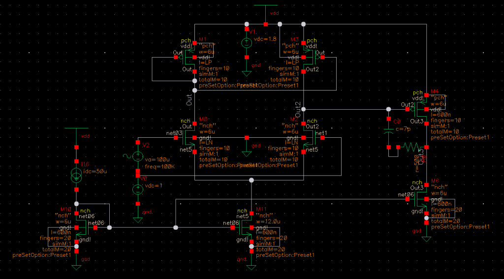 To get myself back in the groove of analog design, I’m hitting the basics. The idea is to try out different topologies and play around with them and see the advantages/disadvantages of each with my own eyes, which will also help give me an arsenal of starting points for future projects. I also want to learn how to properly set up testbenches in Cadence so I can quantitatively benchmark these against each other.