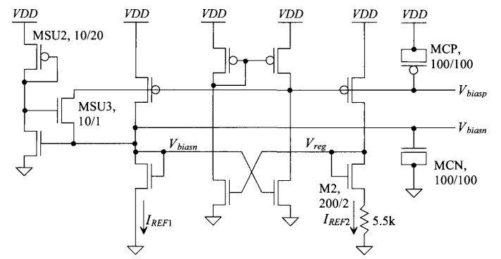 As we discovered in my horrendous attempt at designing a telescopic cascode op-amp, issues in biasing can lead you to chase your tail for days and waste precious time that could go towards actually designing the core part of the circuit. Baker’s CMOS book strongly suggests numerous times throughout to create a “beta multiplier reference” (BMR) which then biases various other transistors or current sources. So that’s what I’m going to try here.