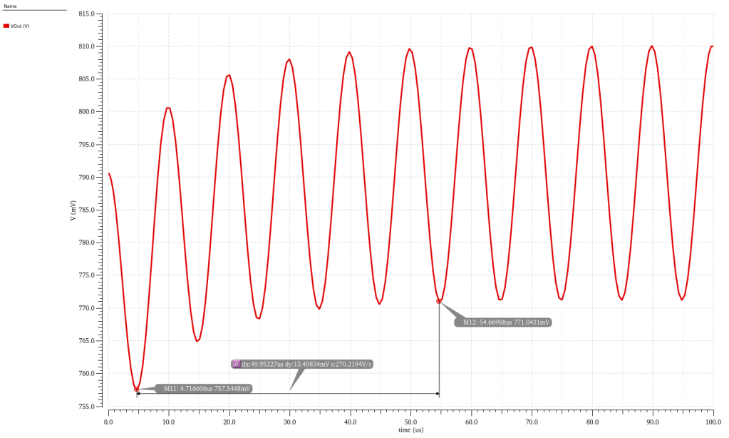 I feel like we have some good bones here for a basic op-amp. The gain is hitting above the target 60dB, and the power consumption is well below the 500uW I wanted. Good transient response, but the open-loop system (below) is unstable. You can see that the gain at the phase crossover is over 13dB. No bueno. Now I turn to Miller compensation to improve the stability of this op-amp. I’m gonna shoot for 45 degrees phase margin.