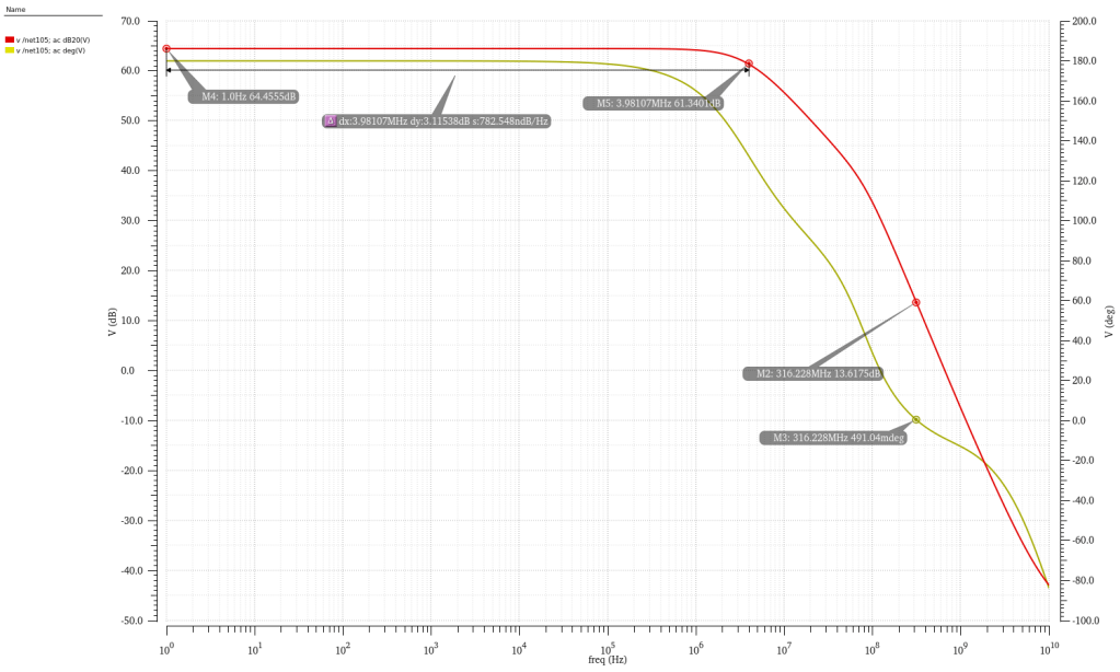 4/8/23 – This is the new frequency response after adding Miller compensation. As you can see, we now have a nice 47 degree phase margin, close to what we calculated. You can also see that the dominant pole has moved way down to 12.5kHz, putting unity gain at 25MHz, where there’s now a zero. But then just after the zero there’s a pole roughly at 150MHz. This zero is not predicted by Miller compensation, but it’s crucial to getting the phase shift to be what we want, and it moves the second pole higher up, which is called “pole splitting”.