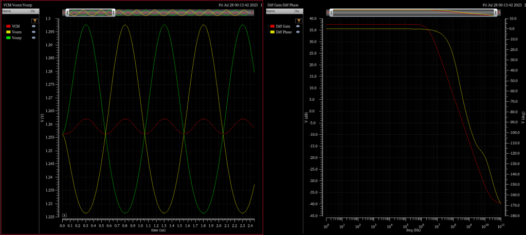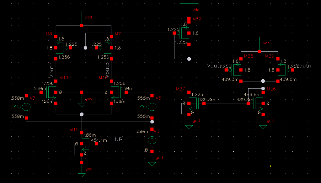 6/5/2023 – This is the first time I’ve designed a fully differential amplifier. I was planning on the telescopic being differential, but I was having so much trouble with it since I was learning how to properly do parametric sweeps, and how to bias. Small steps.