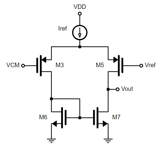 Next step is to take that common mode voltage and compare it to something, a current or voltage. I know what I want the common mode to actually be, I can just create an error amplifier. Note the polarity here. If VCM goes up, it’s because the active loads of the original amplifier are being pulled into triode mode because the Vsg is too great, which means their gate voltage is low and needs to go up, and in this case Vout will go up and put the PMOSes back in saturation and stabilize the drain voltages per Vref.