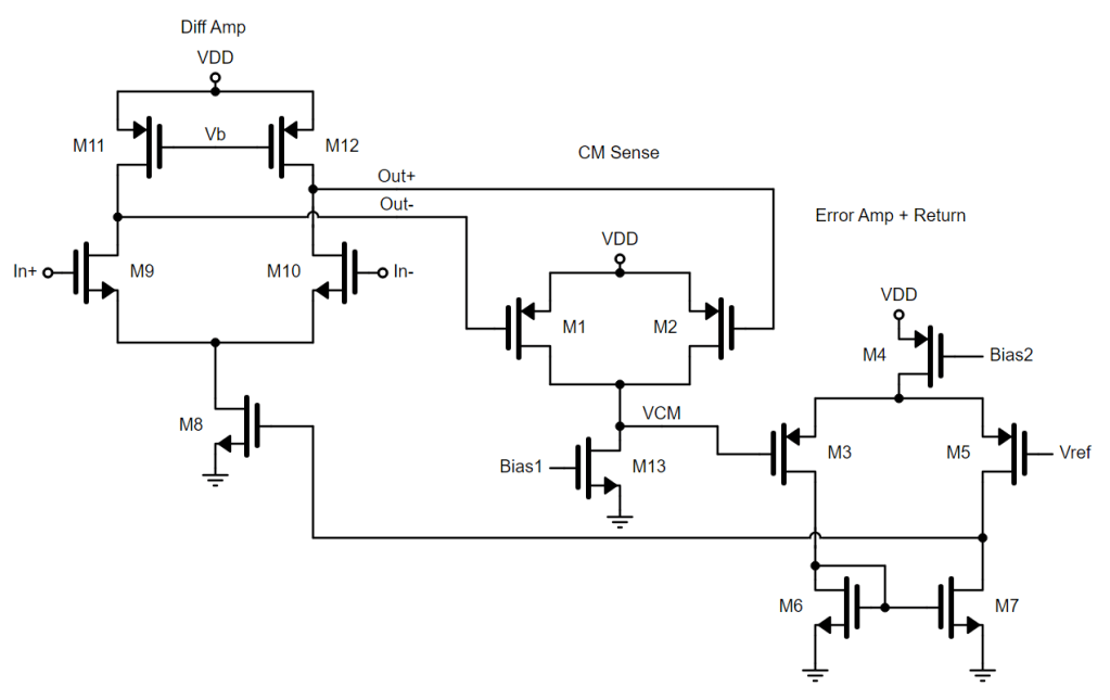 Putting it all together, this is what the op-amp looks like. Interesting how many more transistors there are to create a fully differential amplifier, even a single stage. Looking at the feedback loop, I now understand why some texts recommend the error amp should simply be a gain of 1. The error is being converted to a current by M8, the tail source, and that current is being converted back to a voltage by M11 and M12. The equation is being directly reversed. These should be equal and opposite. So unity gain it is, which is nice because that means we can use smaller transistors, so even though the CMFB has more devices they should be a small footprint overall.