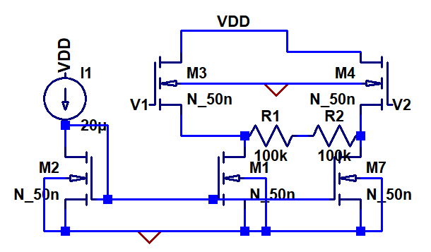 I’ve decided I’m going to try something else. Put my brains to use here. I’ve been doing a bit *too* much reliance on numerical methods and copying topologies from references, while neglecting to do proper small signal hand analysis and actually thinking about the amplifier design and feedback loop. First off, rather than controlling the tail current, I’m going to set the tail current with a current mirror like normal and then control the gate of the PMOS loads instead.