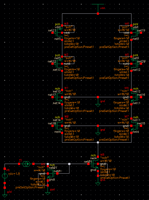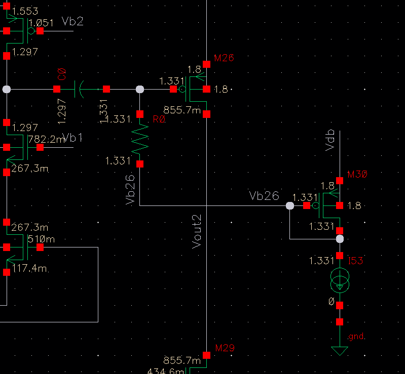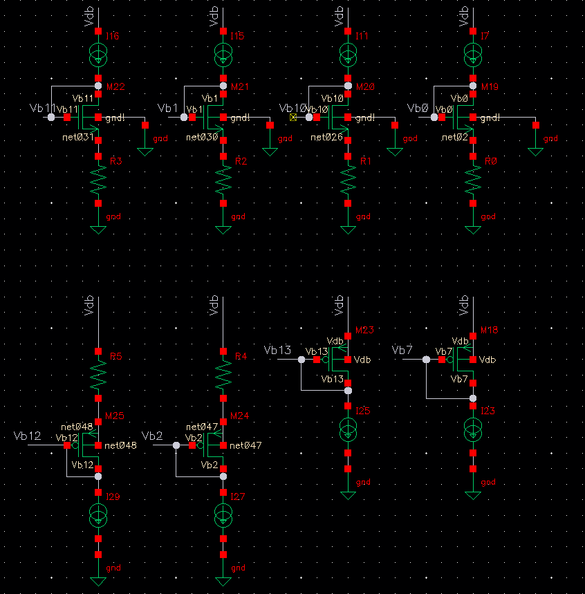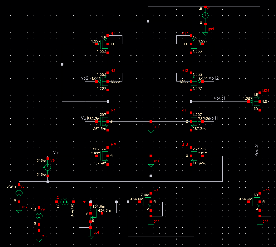 Before I test this out, I need to bias all the transistors. This is no small task, I don’t want to simply pick a voltage that’s within a window that will keep each device in saturation. Better to properly have the biases set by current mirrors. It’s like Baker says “the three most important things in analog design are biasing, biasing, and biasing.”
