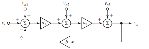 The reason a wide bandwidth is important is because of how negative feedback reduces noise. When noise goes through a feedback loop, it is first amplified up by each stage, and then loops back around where it’s divided down by each stage. The result looks something like this: