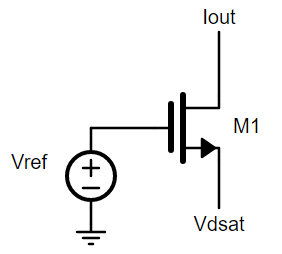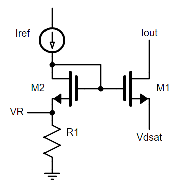 Reading through Baker’s CMOS book, he goes into quite a bit of detail on a Beta-Multiplier Reference circuit which can be used to generate biases for a variety of circuits and situations. I’m studying up on it but in the meantime I need to just get this core telescopic OTA working in the first place. What I’m going to do is set up biasing for each transistor as a current mirror, but I need to take care that both transistors are floating in a similar way and staying in saturation. My plan is to use the scheme below. I think if I keep VR roughly similar to Vdsat, it should be okay. With this simple current mirror setup, the concern is the output current changing with varying Vds, but in the telescopic op-amp that will be a fairly restricted range. At least that’s my thinking.