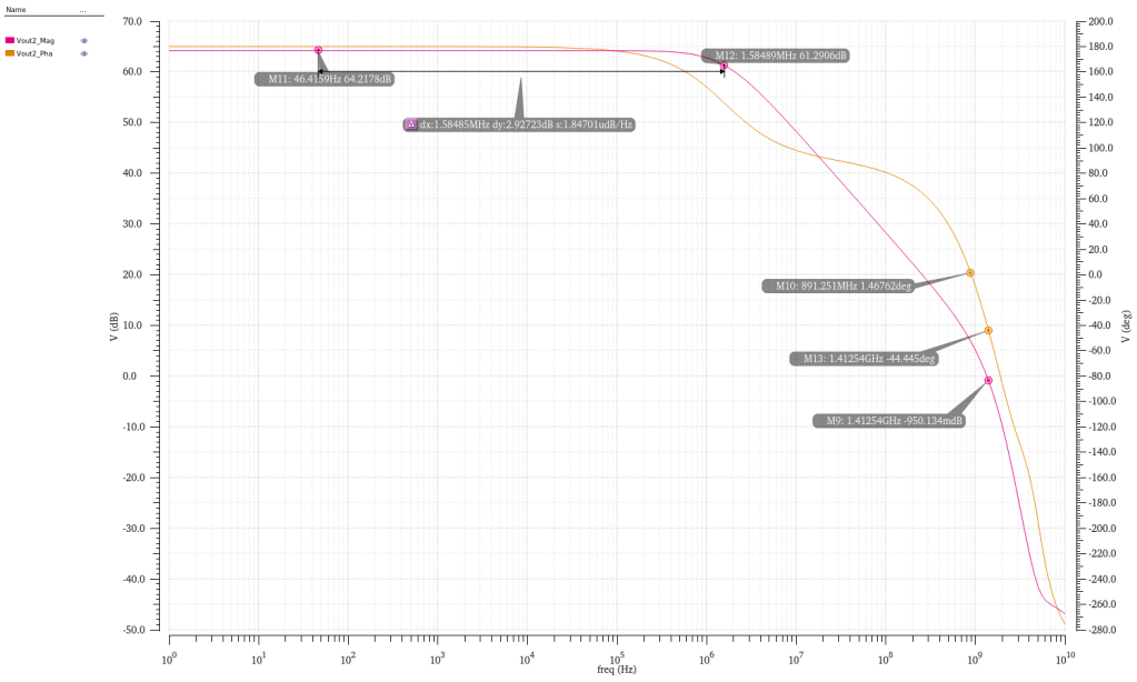 These are promising results. I designed for a gain crossover of above 1GHz, and got one of 1.4GHz. I wanted the second stage to have a gain of 15dB, if the total gain is 64dB and the first stage is roughly 52dB, that’s a gain of 12dB. I would’ve like maybe a bit more but for a 1.4GHz GBW op-amp, 64dB open-loop gain is phenomenal. You can also see how it’s a perfect -20dB/decade slope from 1.6MHz to 1.4GHz. I love that.