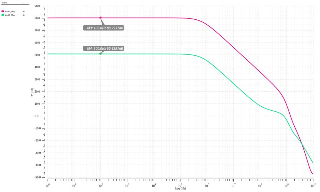 What’s interesting with this though is that when I look at the operating conditions of the CS stage, it has a gm of 2.4mS and an rds of 26kOhms, which should give me a gain of 35dB. If that’s so, shouldn’t the gain of the whole thing be more like 80 something dB? Indeed when I plot the output of the first stage, it’s been degraded by the biasing. The gain of the first stage is actually dependent on the value of the resistor used by the biasing circuit. If I increase the resistor from 10kOhm to 1.0MOhm, the gain of the first stage goes back up to ~51dB, and the second stage is 30dB, with the overall gain being above 80dB. That’s a spicy meatball!